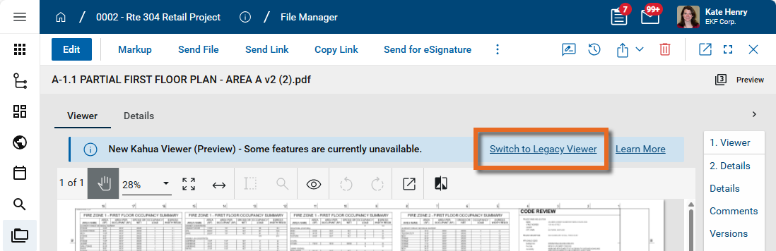 This new viewer provides significantly improved performance. Many viewing functions remain the same. Some functionality, including the markup tool and image rotation, require viewing a file in the legacy viewer. You can switch back and forth between the viewers by selecting Switch to Legacy Viewer or Try New Viewer. Your selection will be retained while you are logged in to Kahua.